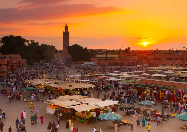 ¿Sabíais que Marrakech es conocida como la Ciudad Roja? Esto se debe al color ocre de sus edificios. El corazón de la ciudad es la plaza Jemaa el-Fna, donde encontraréis encantadores de serpientes y puestos de comida. Además, la mezquita Koutoubia, declarada Patrimonio de la Humanidad, el Palacio Bahia, los jardines Majorelle y el zoco son lugares de visita obligada.